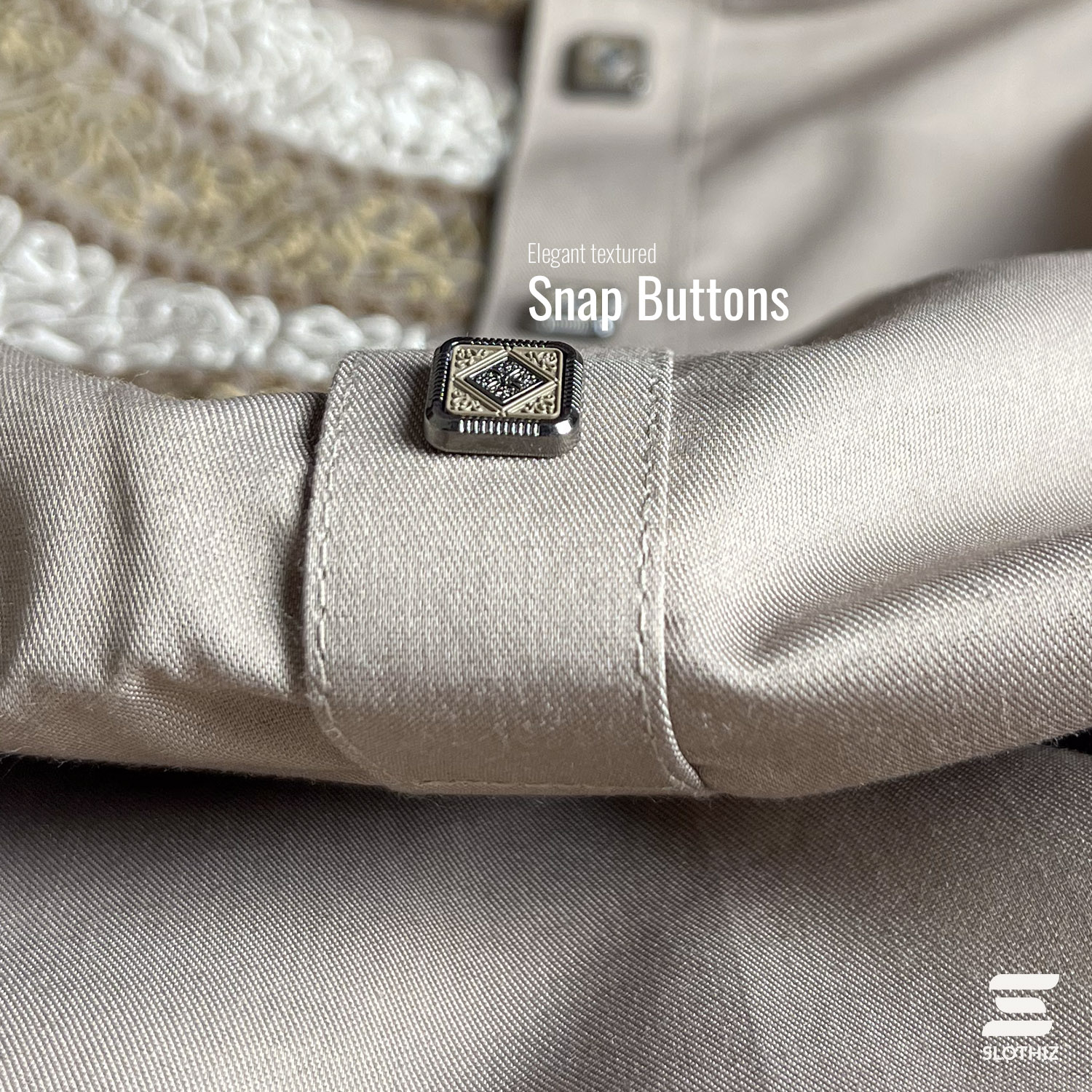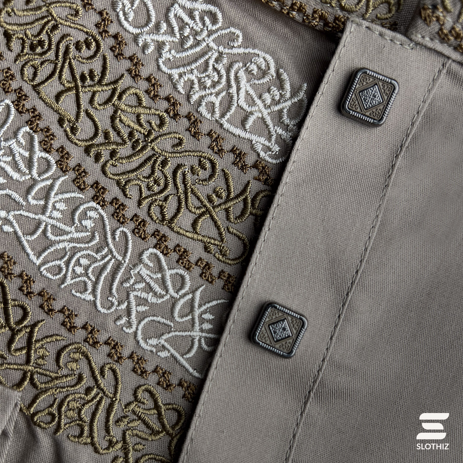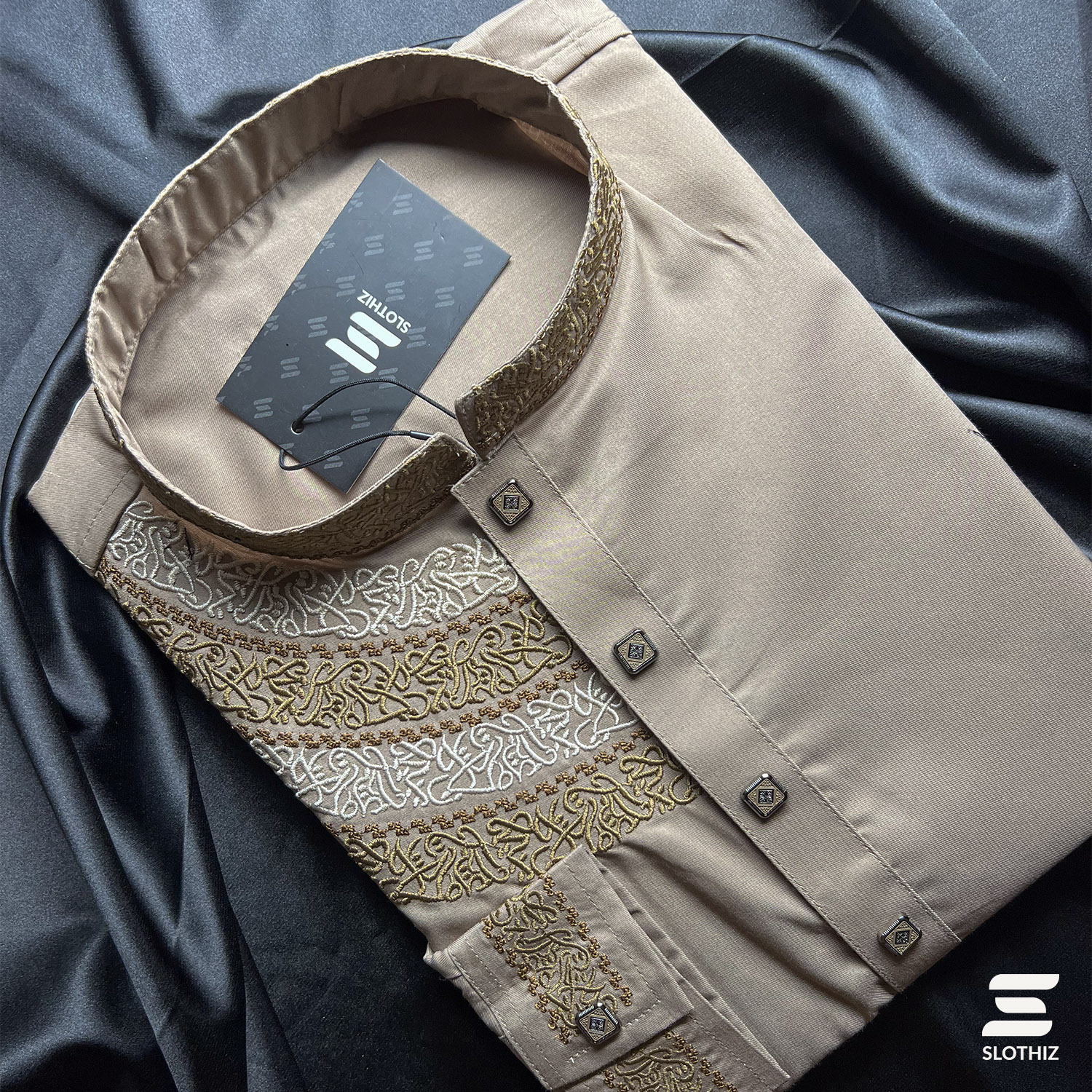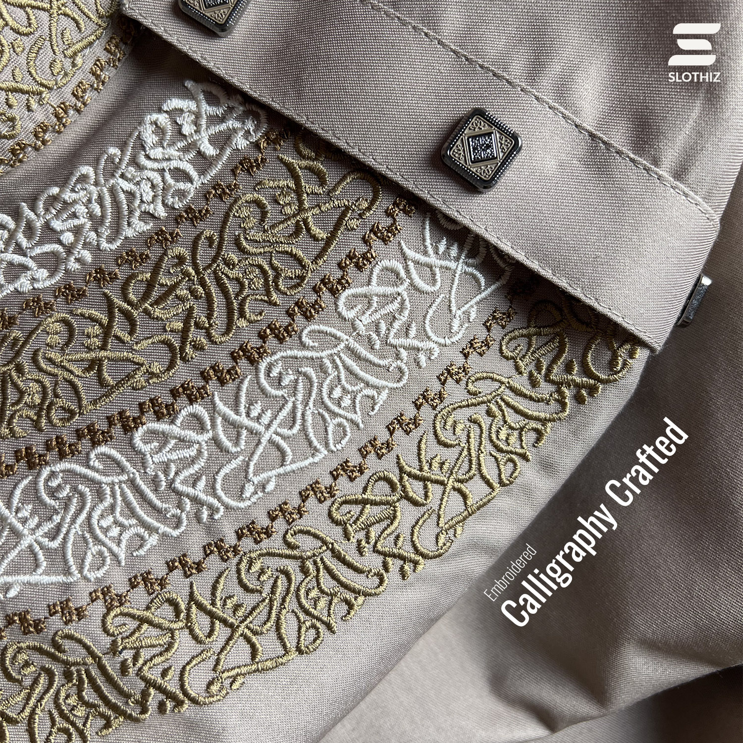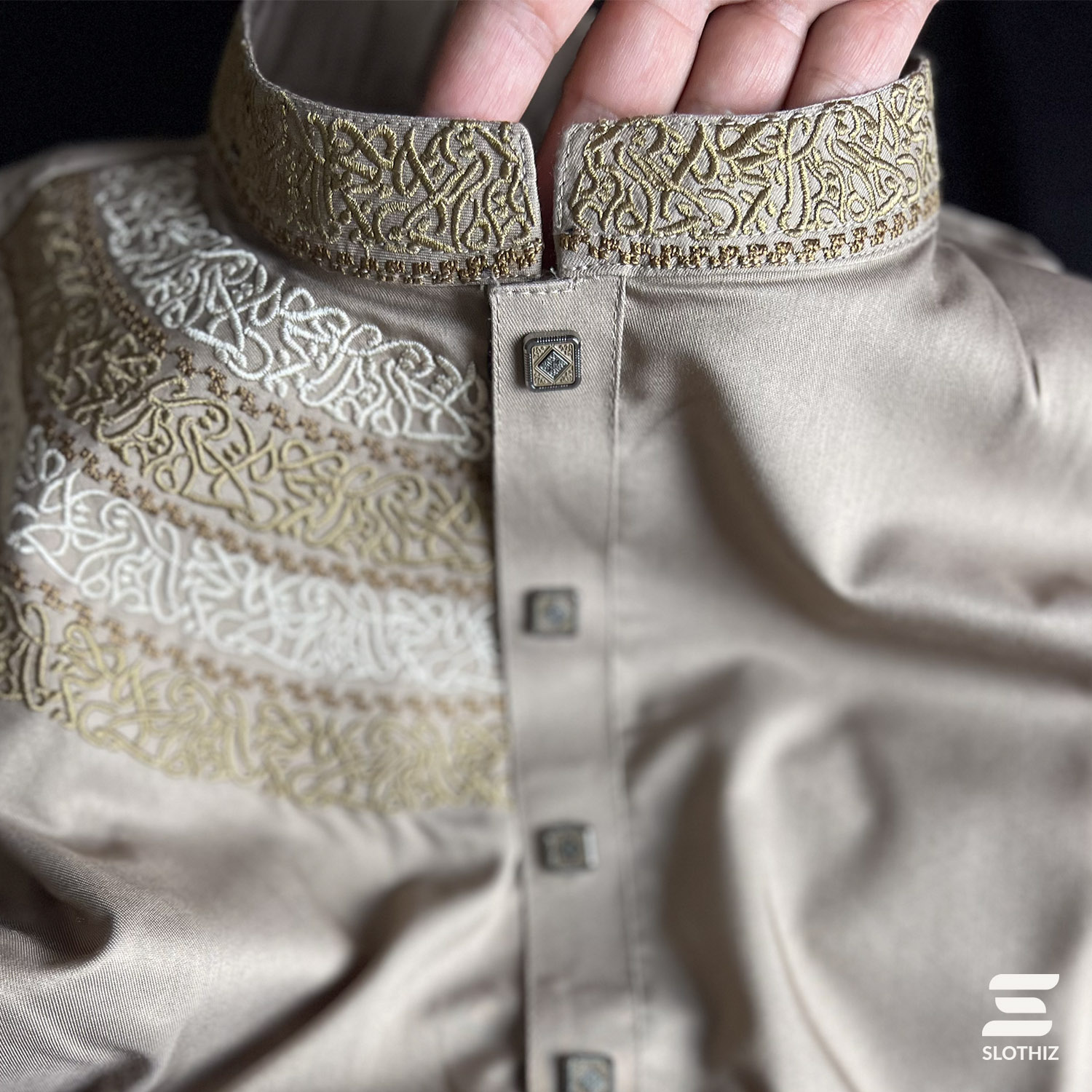 Intricate white and black calligraphy embroidery enhances the band collar, chest panel, and cuff area, creating a balanced contrast against the biscuit tone. Textured premium buttons complete the design with a subtle luxury finish. The tailored fit provides a sharp, structured silhouette without compromising comfort.